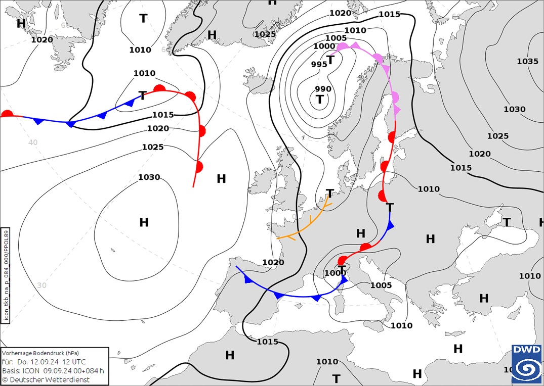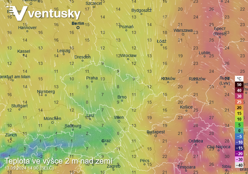 Zvlněná studená fronta přinese koncem týdne výrazný teplotní kontrast do střední Evropy (teploty v pátek ve 14 hodin)