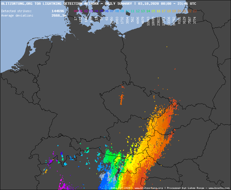Blesky za sobotu ve sřední Evropě (barevně odlišeny dle času)