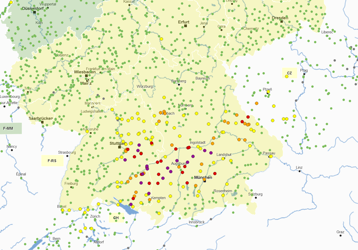 Povodňové stupně v Německu v 18:00 - zelená normální stav, fialová extrémní