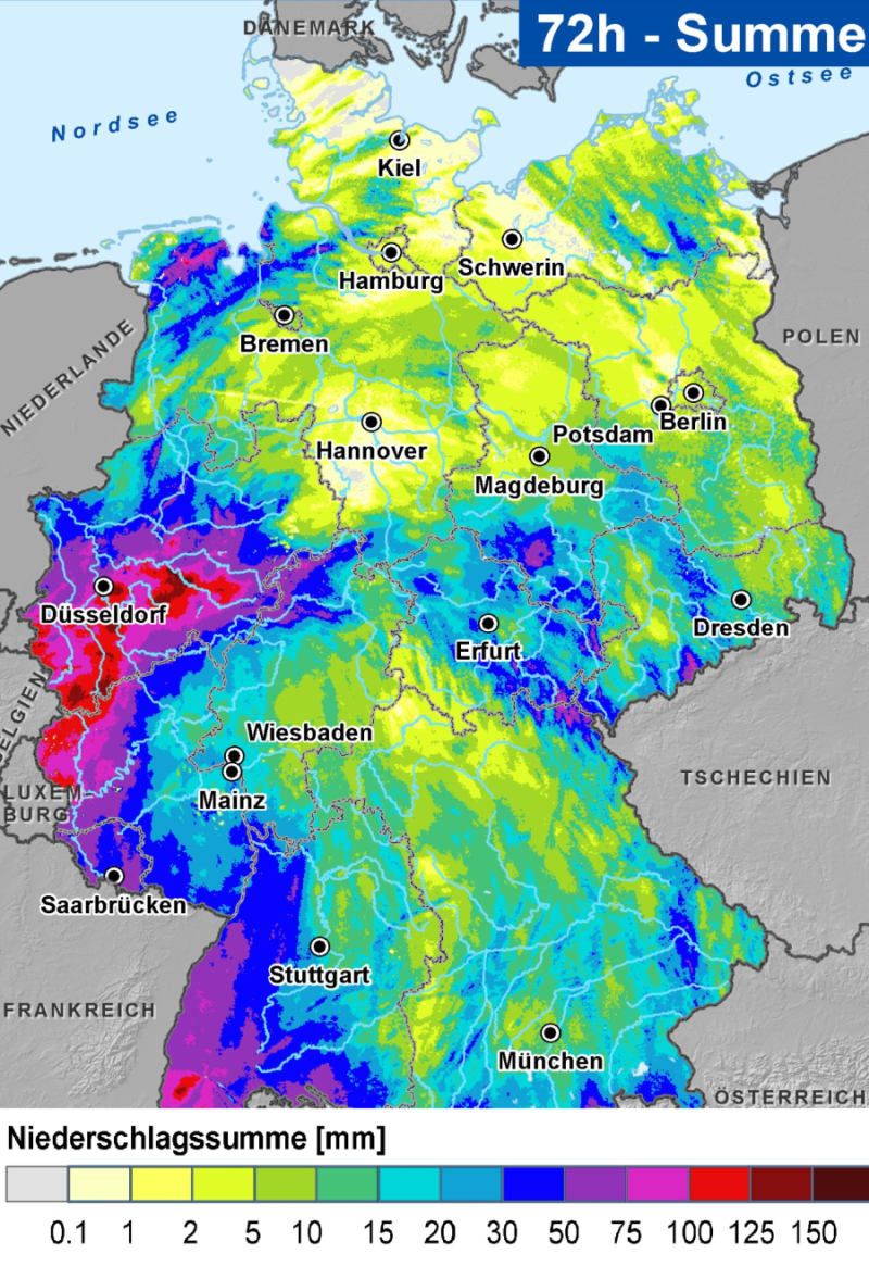 Srážkové úhrny po 24 hodinách (dnech) - první obrázek ukazuje srážky za pondělí, následuje úterý a poslední je středa, kdy se právě vyskytly extrémní úhrny v oblasti Eifel (temně červená barva na mapě)