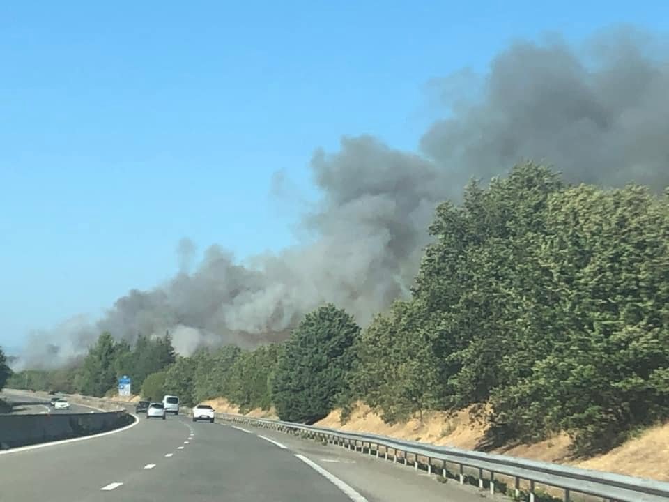 Počátek rozsáhlého požáru ve Francii, který vznikl u dálnice (zachytila Virginie Gedda)