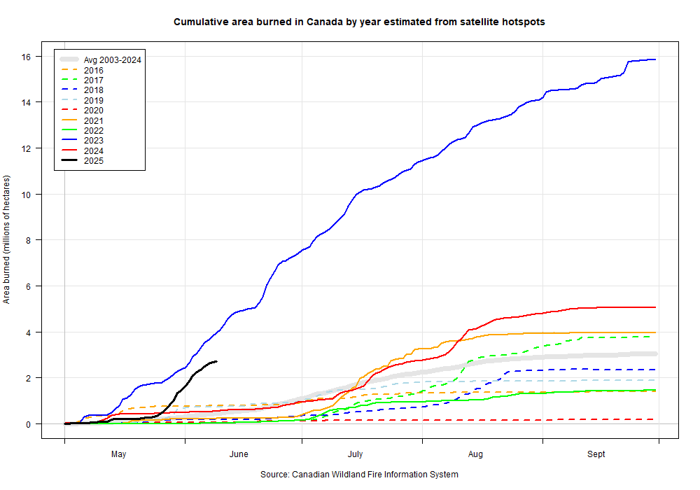 I během června a července by mělo panovat v západní polovině Kanady nadprůměrné riziko vzniku a šíření požárů