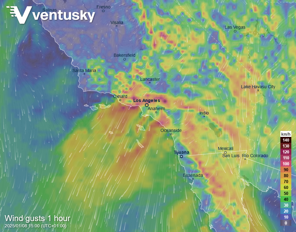 Rychlost větru v nárazech v oblasti s požárem dnes odpoledne našeho času