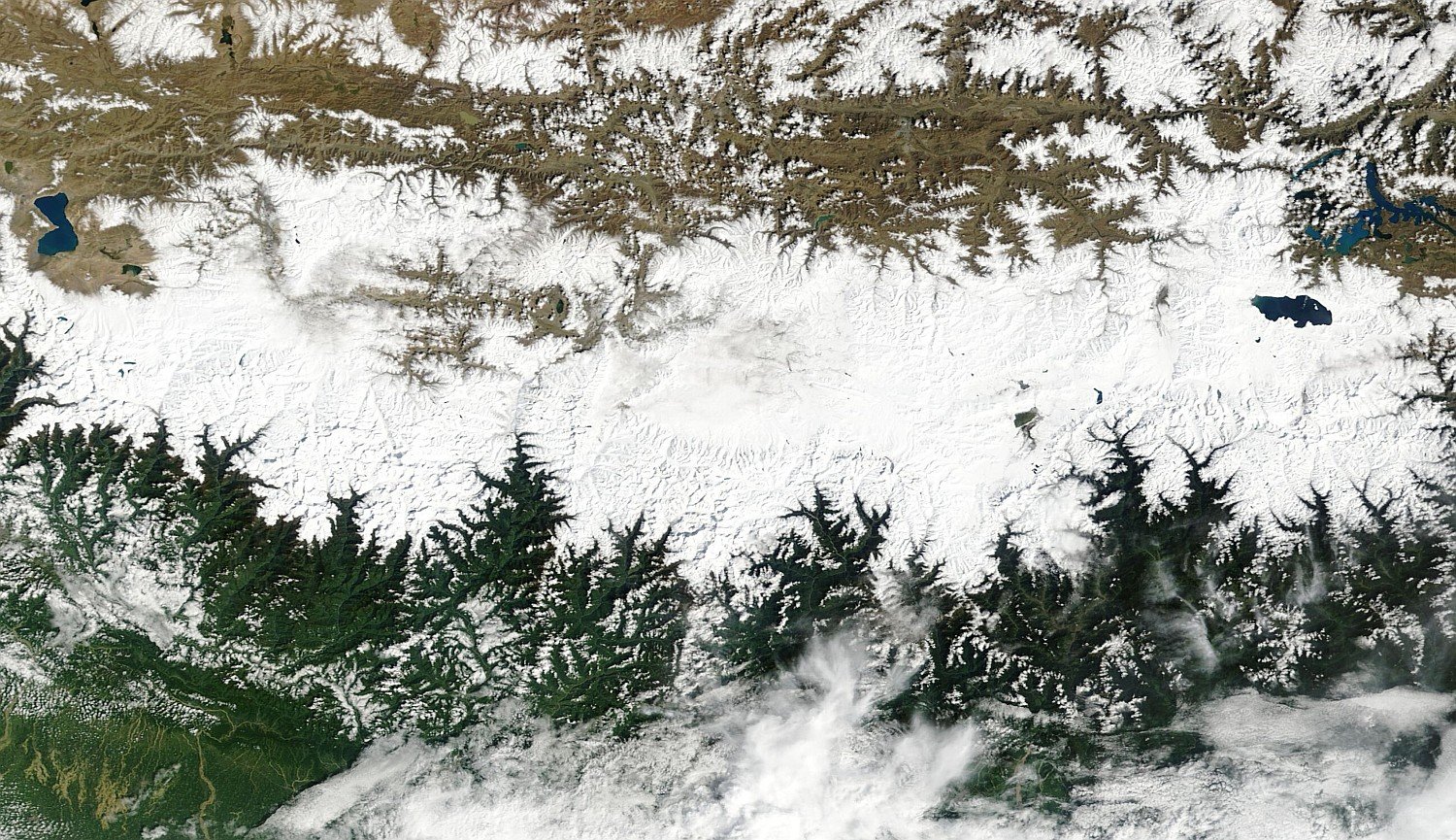 Centrální oblast Himalájí po víkendovém sněžení na družicovém snímku