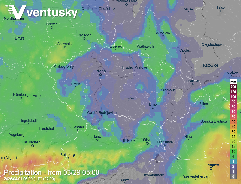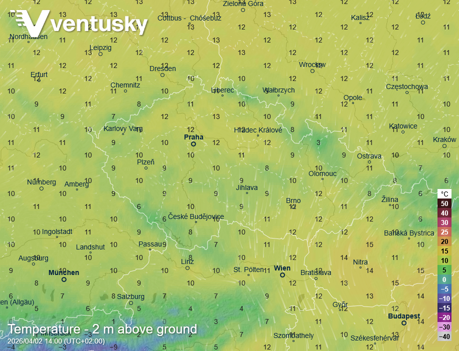 Očekávané teploty ve čtvrtek odpoledne - už často překročí 10 °C, ale pro začátek dubna jde stále o lehce popdrůměrné hodnoty