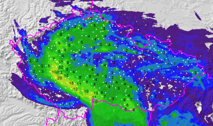 Srážky od včerejších 8:00 do dnešních 8:00 - nejvíce srážek spadlo v úzkém páse na jihozápadě Čech, i přes 15 mm