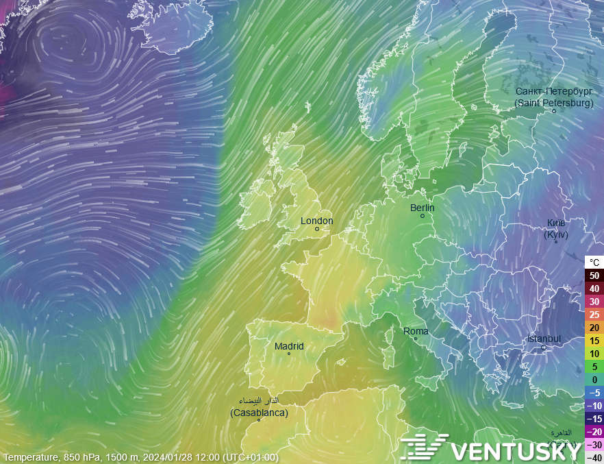 Teplota v hladině 850 hPa dnes v poledne - na západ Evropy se dostává z jihu teplý vzduch