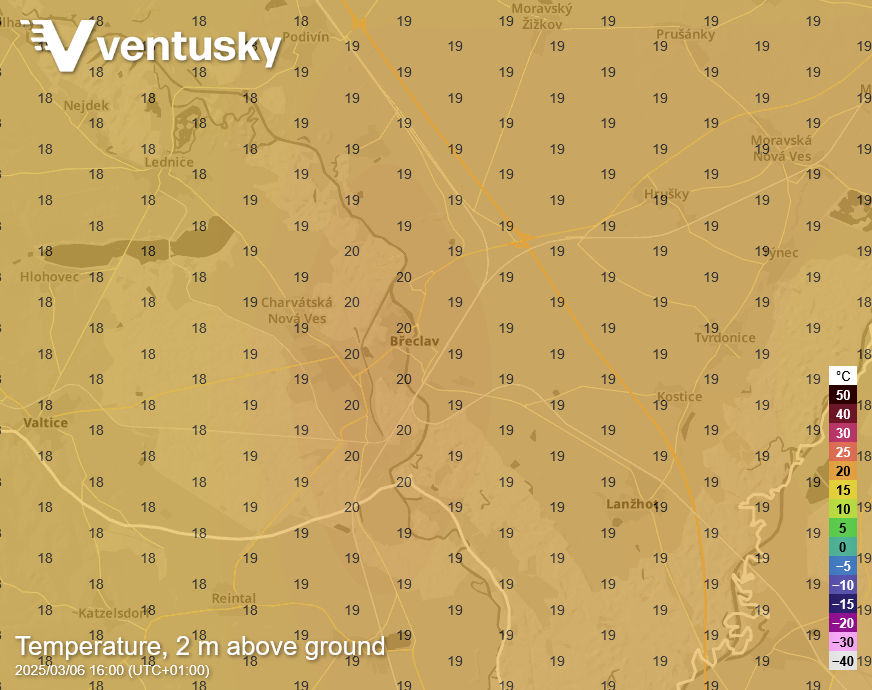 Očekávané teploty zítra odpoledne - u Břeclavi modely čekají 20 °C