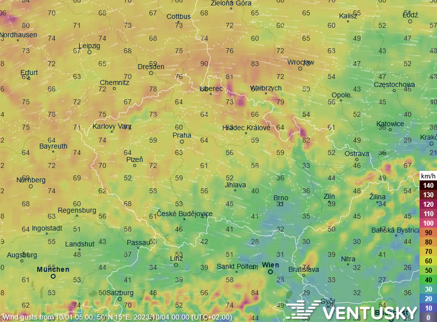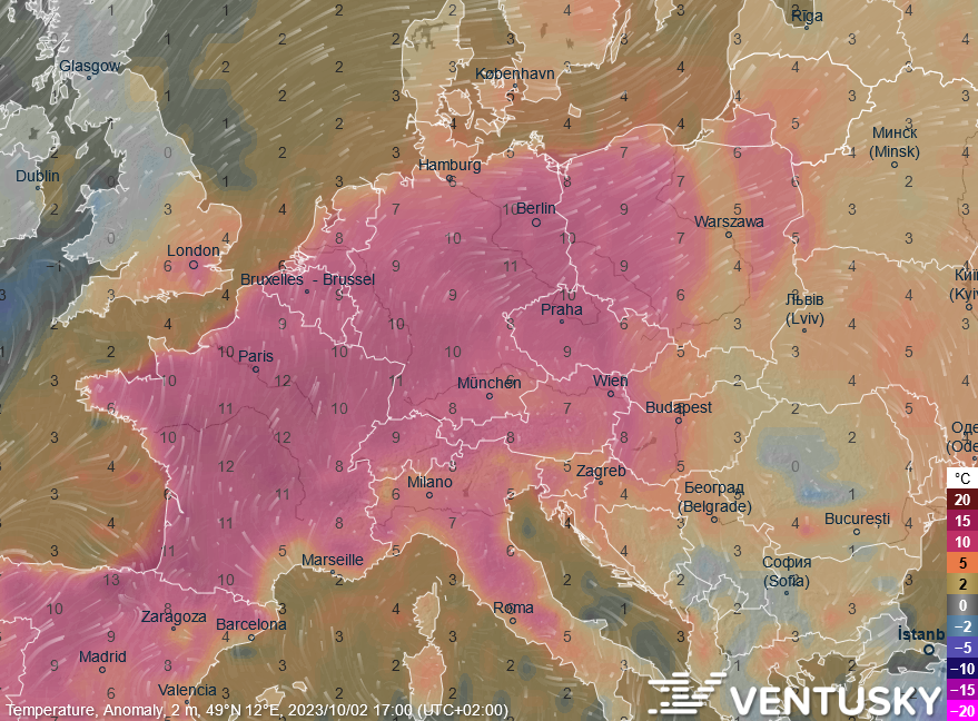 Odchylka teplot od průměru za posledních 40 let v pondělí odpoledne - teploty budou výrazně nadprůměrné (až o 10 °C vyšší, než je běžné), na pomezí Německa a Francie může být až 30 °C