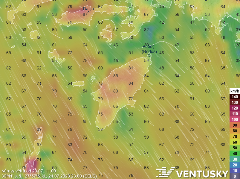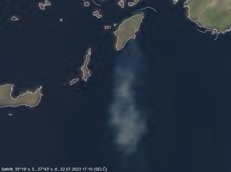 Satelitní snímek ostrova Rhodos ze včerejších 17:00 - na jih se stovky kilometrů daleko šíří mohutný dým z požáru