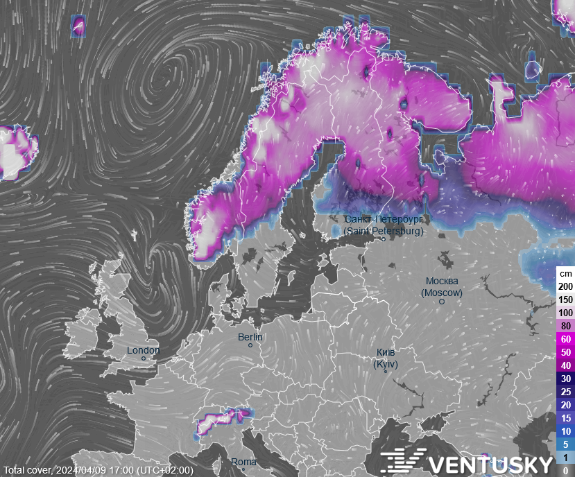 Sněhová pokrývka v Evropě 9. dubna 2024