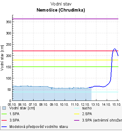 Předpověď výšky hladiny řeky Chrudimky na stanici Nemošice - během středy se dostane přes 200 cm