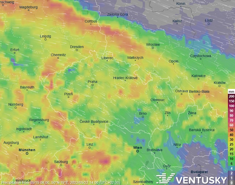 Očekávané celkové srážkové úhrny za příští týden - zapršet by po dlouhé době mělo na celém území. Spadne většinou od 10 do 30 mm srážek