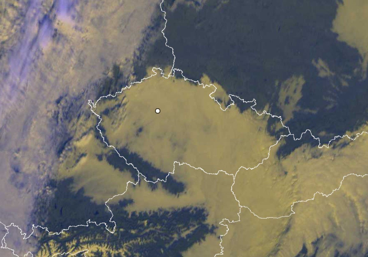 Satelitní snímek dnes ve 12:00 - mimo pohraničí byla bez nízké oblačnosti jen centrální část Brd