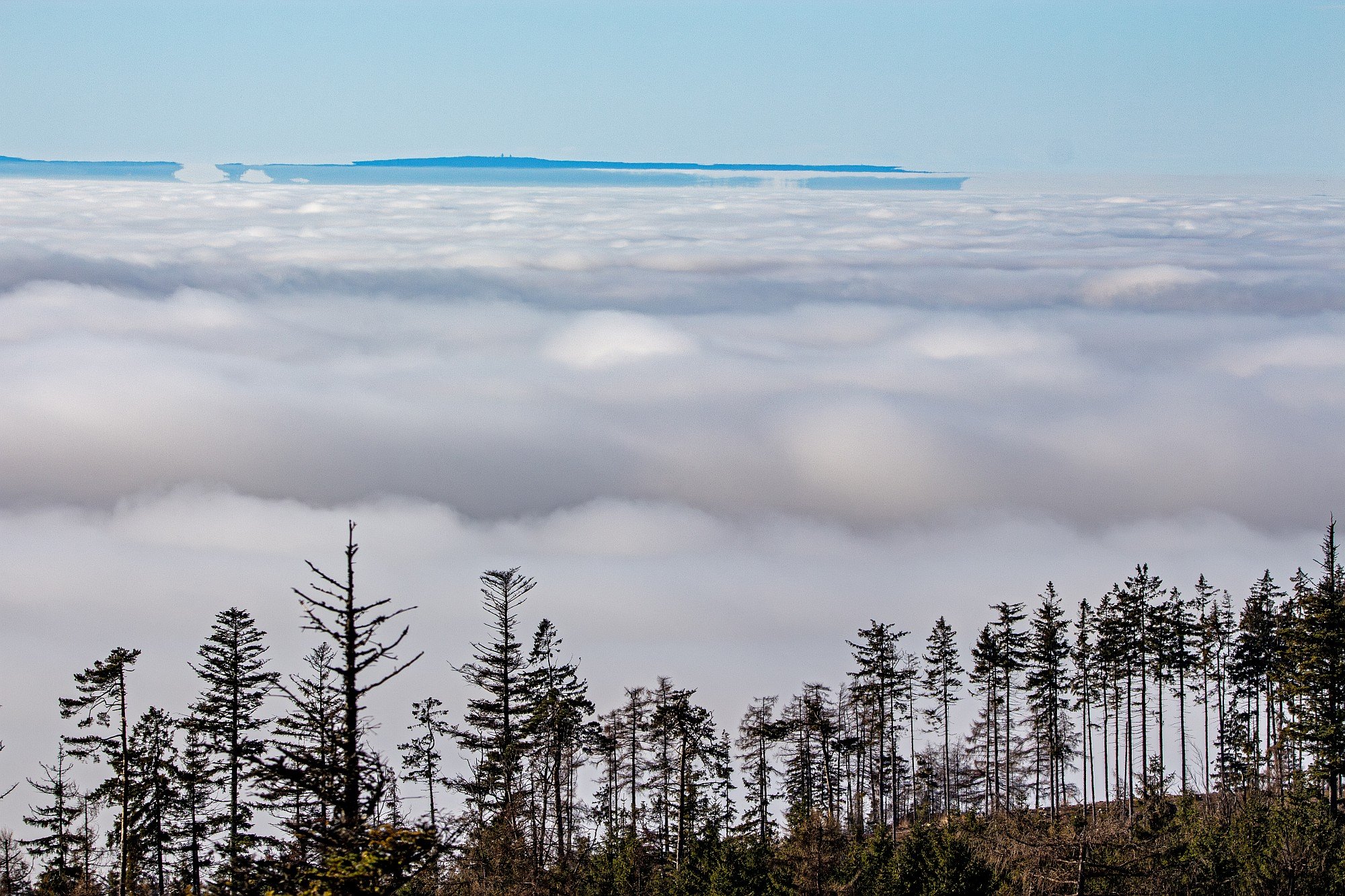 Sluncem zalité vrcholy Brd nad nízkou oblačností nabídly nádherné zrcadlení