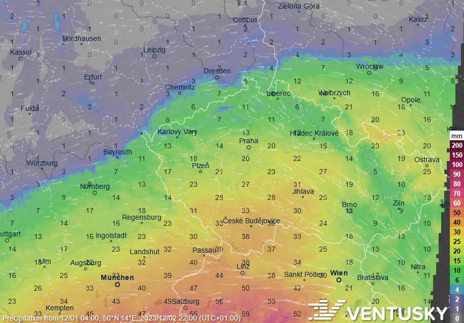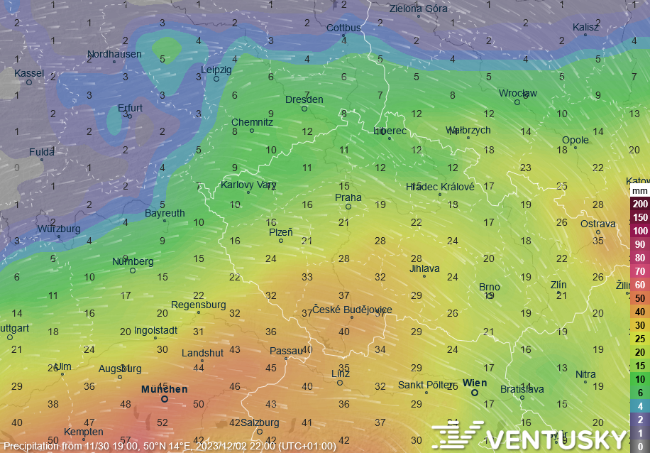 Očekávané srážkové úhrny za pátek a sobotu podle modelu ECMWF - 1 mm srážek odpovídá přibližně 1 cm sněhu