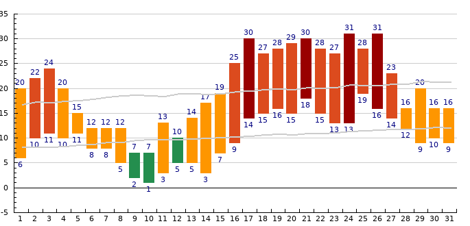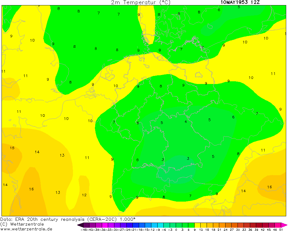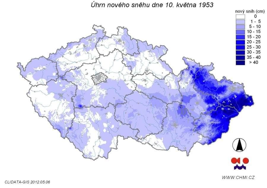Vývoj teplot v květnu 1953 na stanici Praha Klementinum (denní minima a maxima) - po výrazném ochlazení přišly rychle tropické teploty