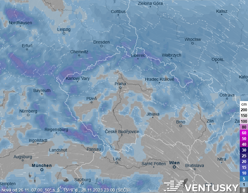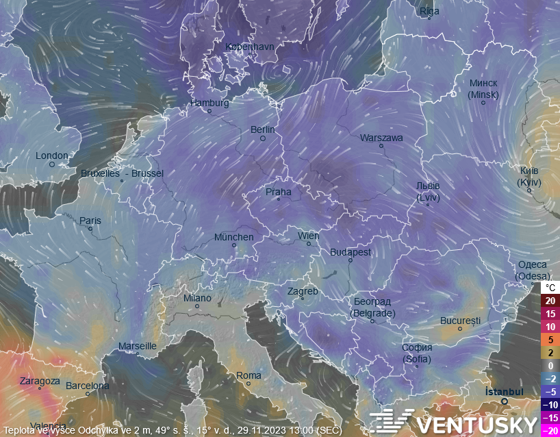 Odchylka teplot od průměru za posledních 40 let ve středu odpoledne - teploty v celé střední Evropě budou podprůměrné