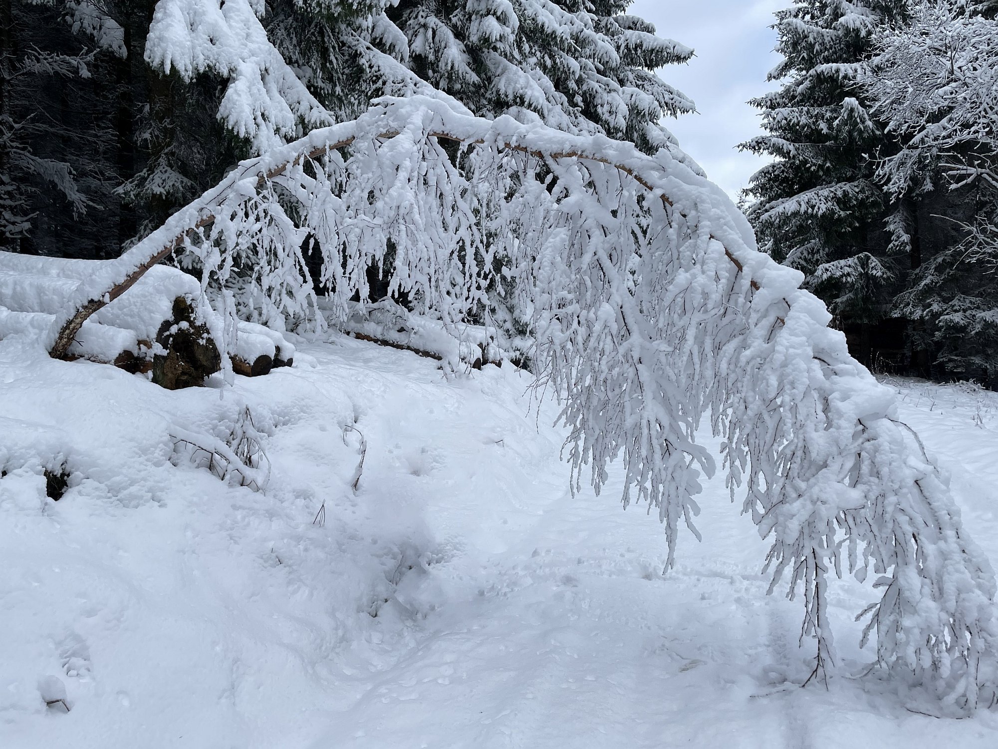 Cesta na Třebouňský vrch dnes dopoledne - těžký mokrý sníh ohýbal stromy