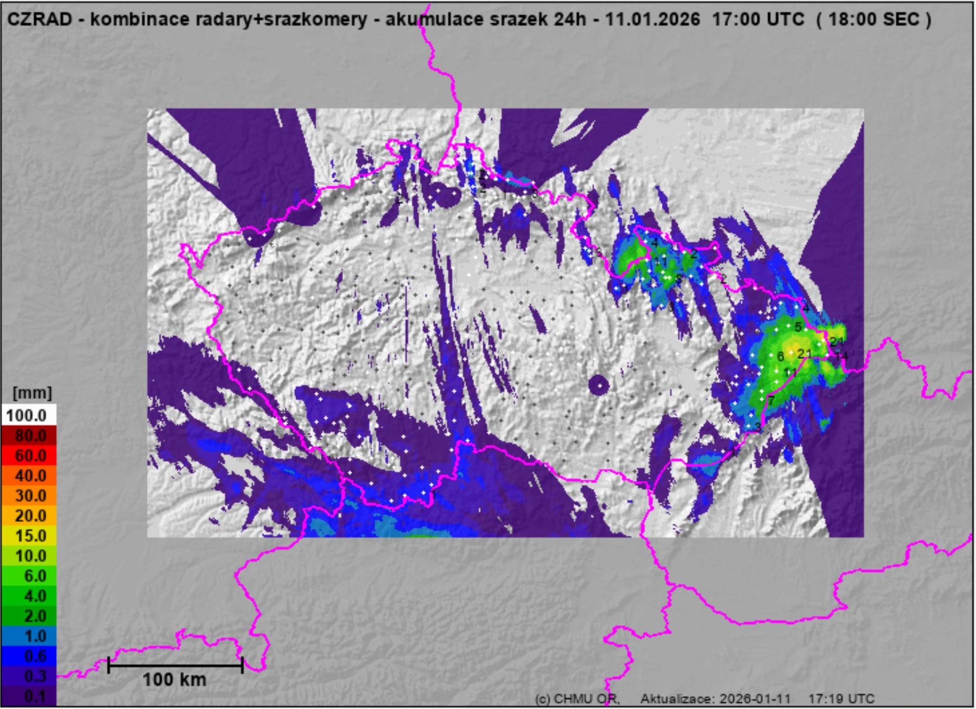 Obr. 2 Množství srážek za posledních 24 hodin (k nedělnímu večeru)