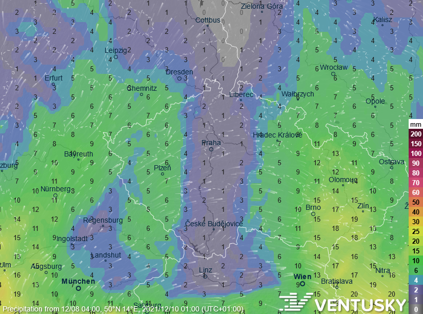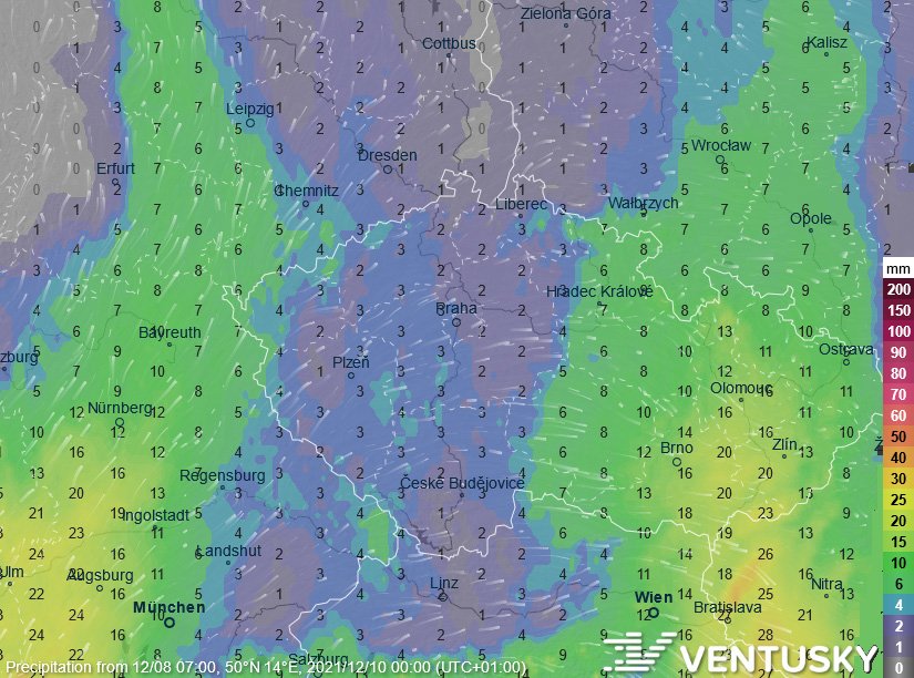 Očekávané srážkové úhrny do pátečního rána podle modelu ICON EU (1 mm odpovídá přibližně 1 cm sněhu) - na východě bude sněžení i vydatné, přes 5 cm může ovšem napadnout i na západě