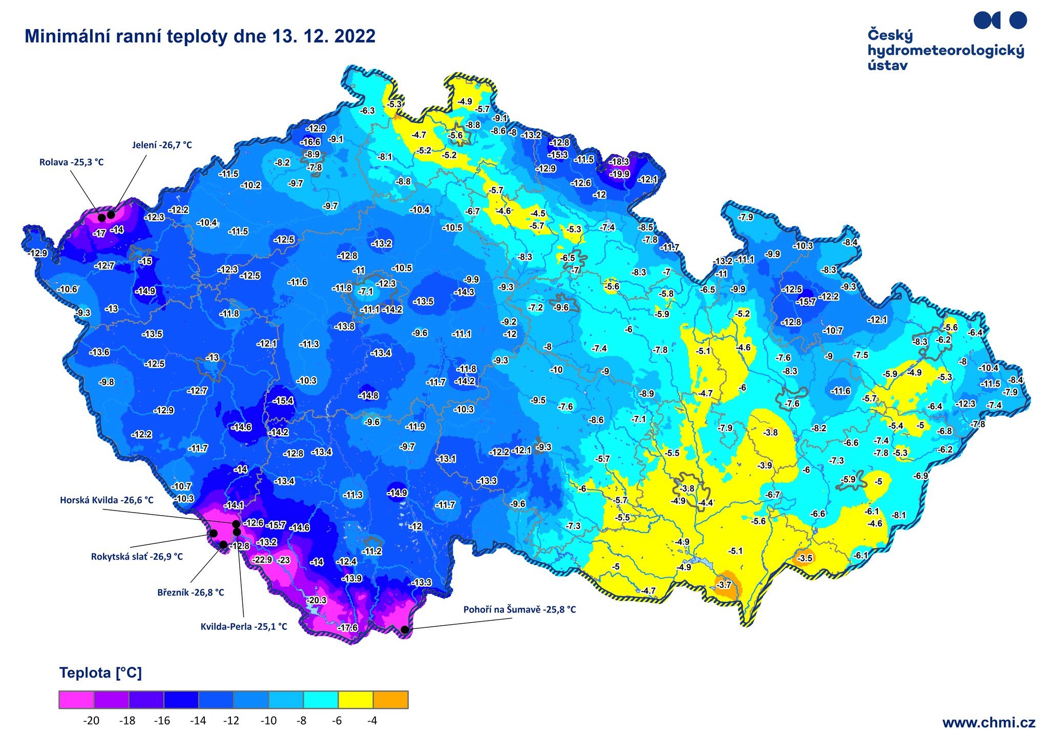 Na většině našeho území leží sníh, na Šumavě, v Beskydech a v Krkonoších až půl metru