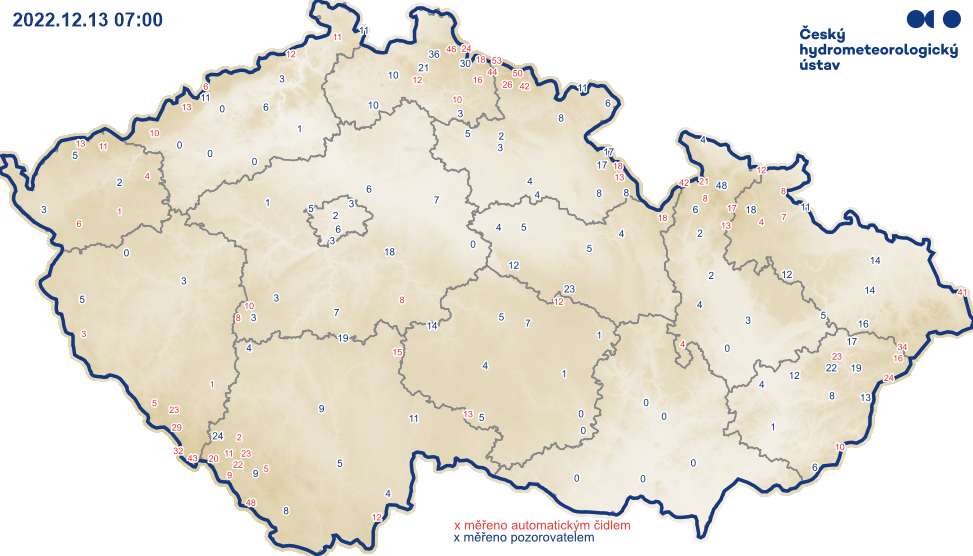 Na většině našeho území leží sníh, na Šumavě, v Beskydech a v Krkonoších až půl metru