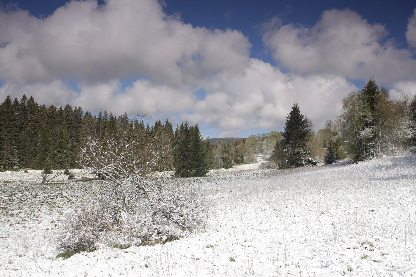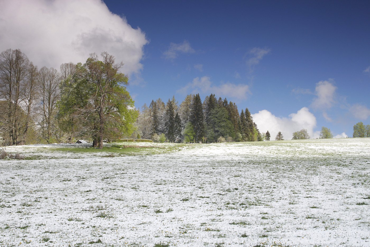 Zhůří na Šumavě dnes dopoledne - rozkvetlé stromy obalil sníh