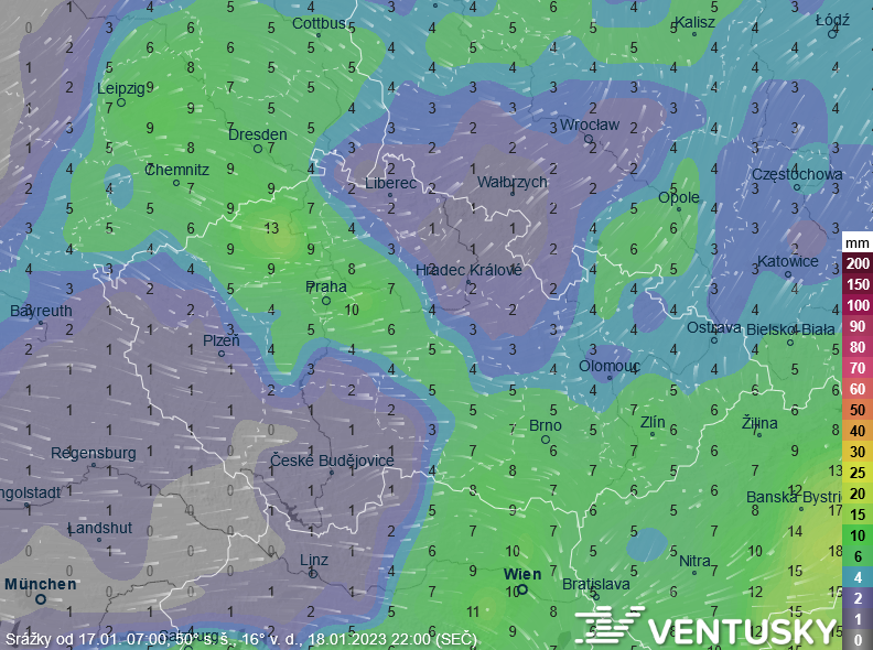 Předpověď množství srážek na středu podle modelu ECMWF - tento model čeká nejintenzivnější sněžení v centrální části Čech, kde čeká až 10 cm mokrého sněhu. Jiné modely čekají trochu více srážek