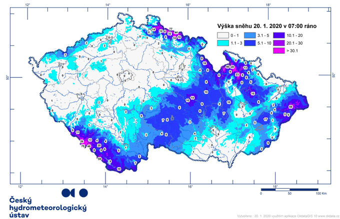 Po víkendovém sněžení je na našem území nejvíce sněhu v letošní zimě. Souvislá sněhová pokrývka leží na zhruba polovině území. Sněhovou pokrývku hlásí hory a hlavně na východě území i střední polohy. V nížinách je sníh jen výjimečně (leží až od přibližně 400 m nad mořem). Ze středních poloh je nejvíce sněhu na Vysočině, kde leží od 5 do 10 cm. Z hor je nejvíce sněhu na hřebenech Krkonoš a Šumavy, kde je až 70 cm sněhu. V Beskydech přes půl metru sněhu leží jen na Lysé hoře. Podobné množství sněhu hlásí i Praděd v Jeseníkách. S klesající nadmořskou výškou množství sněhu na horách rychle klesá. V polohách kolem 900 m leží většinou jen kolem 10 cm sněhu. Z toho důvodu je většina běžeckých stop stále nesjízdných a na sjezdovkách se lyžuje především na technickém sněhu. Množství sněhu je pro polovinu ledna výrazně podprůměrné. Rekordně nízké ovšem není. V roce 2014 bylo sněhu ještě méně.