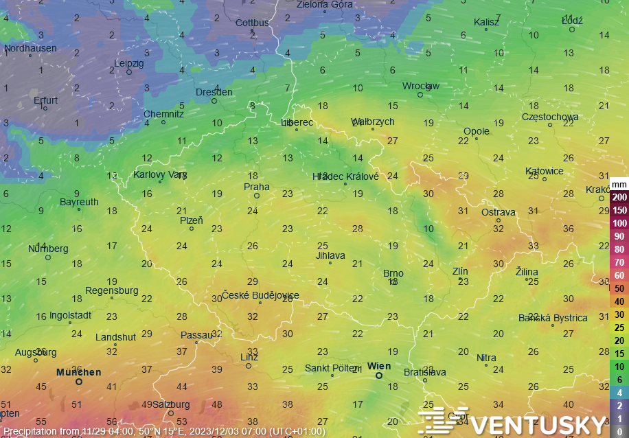 Očekávané srážky za pátek a sobotu podle modelu ICON EU - 1 mm odpovídá přibližně 1 cm sněhu