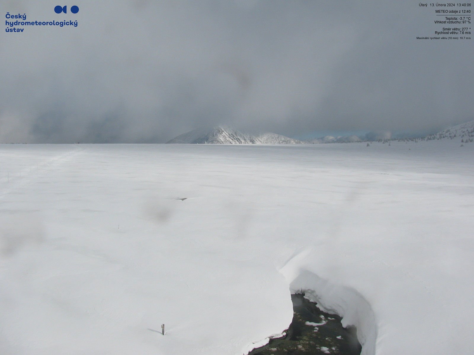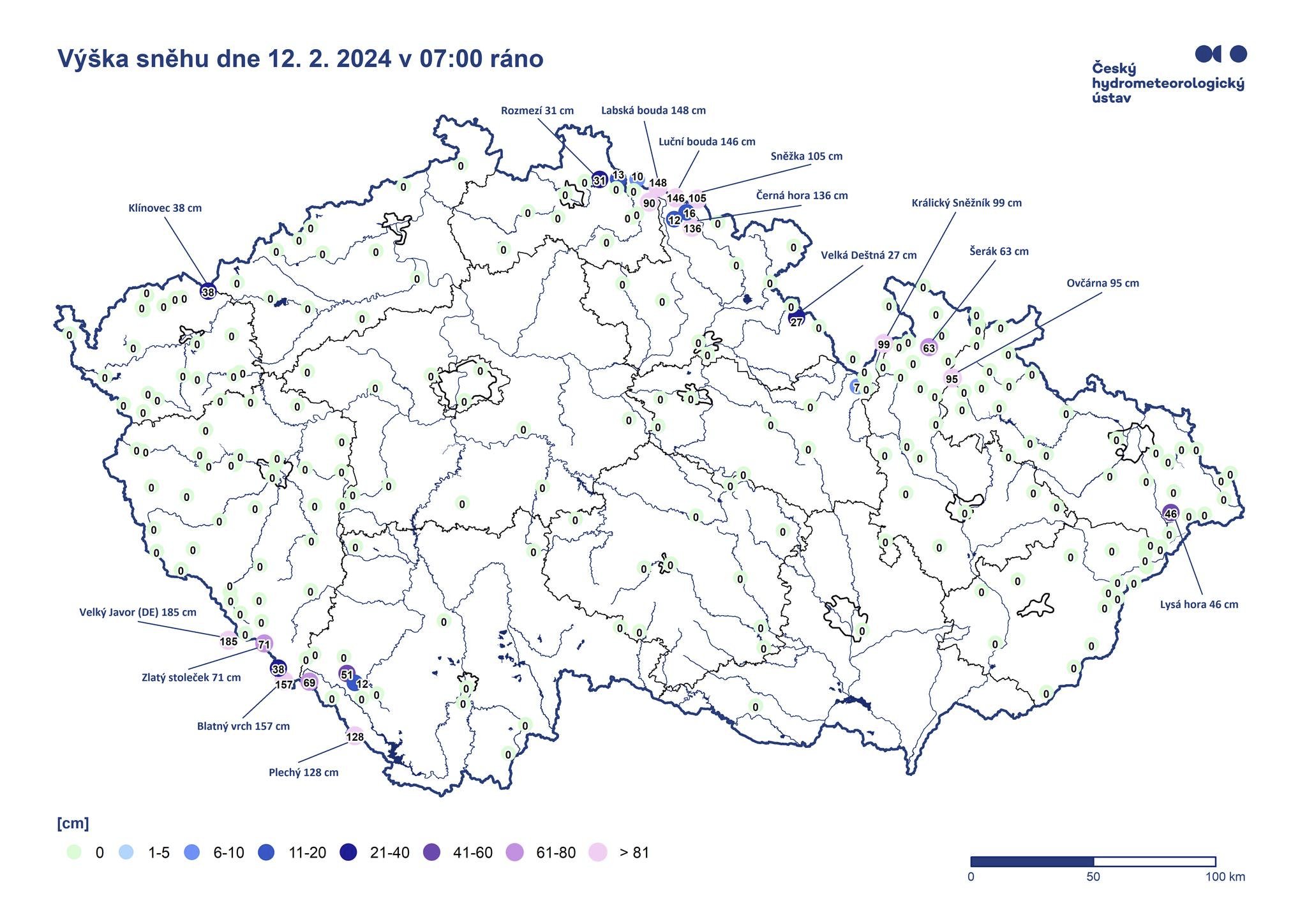 Množství sněhu na našem území - měření ze stanic, větší množství sněhu hlásí jen hřebeny