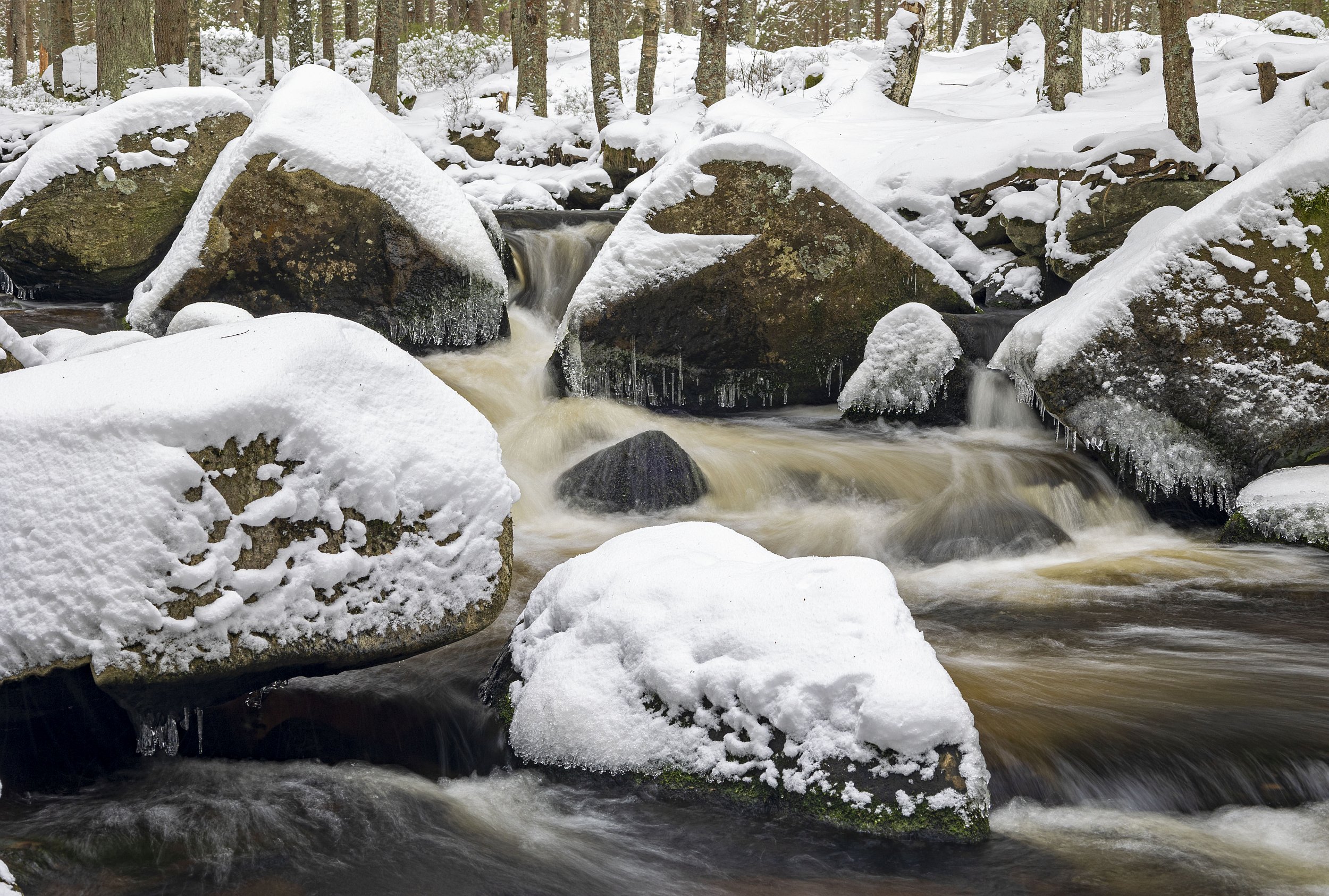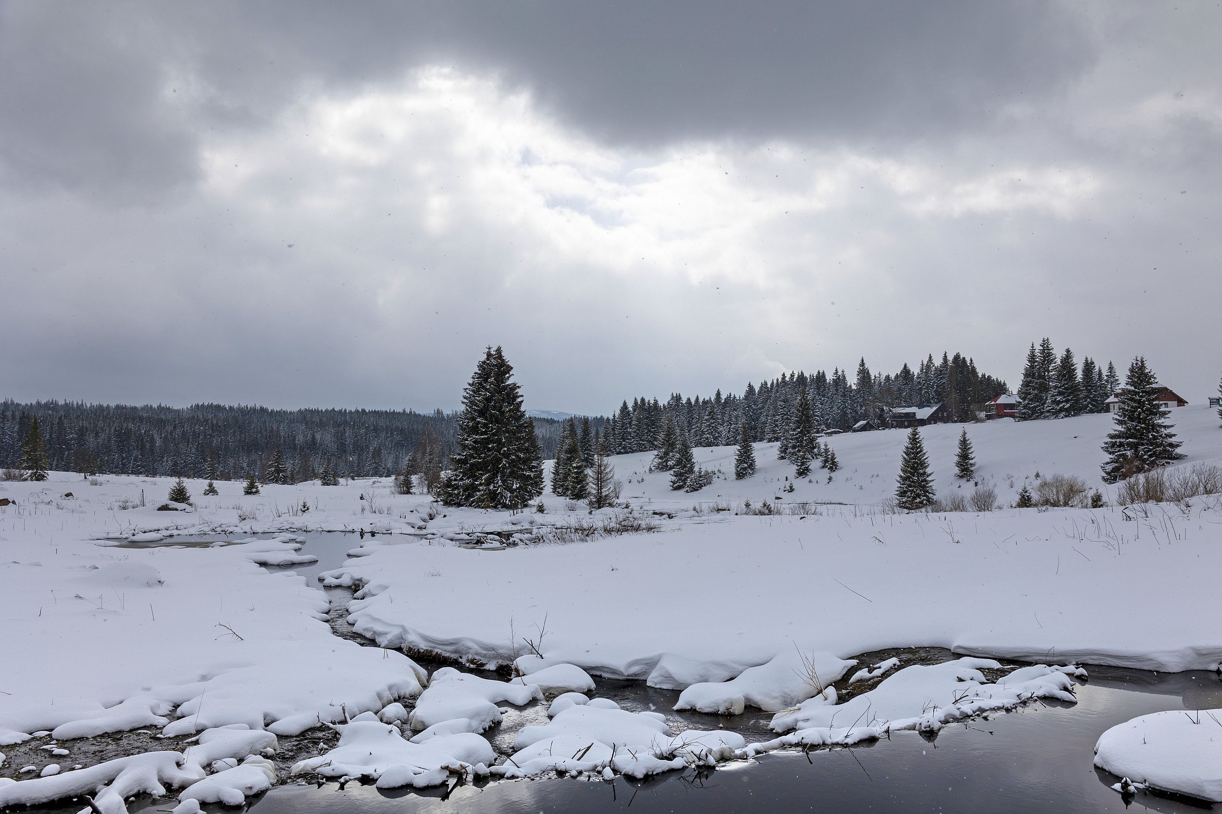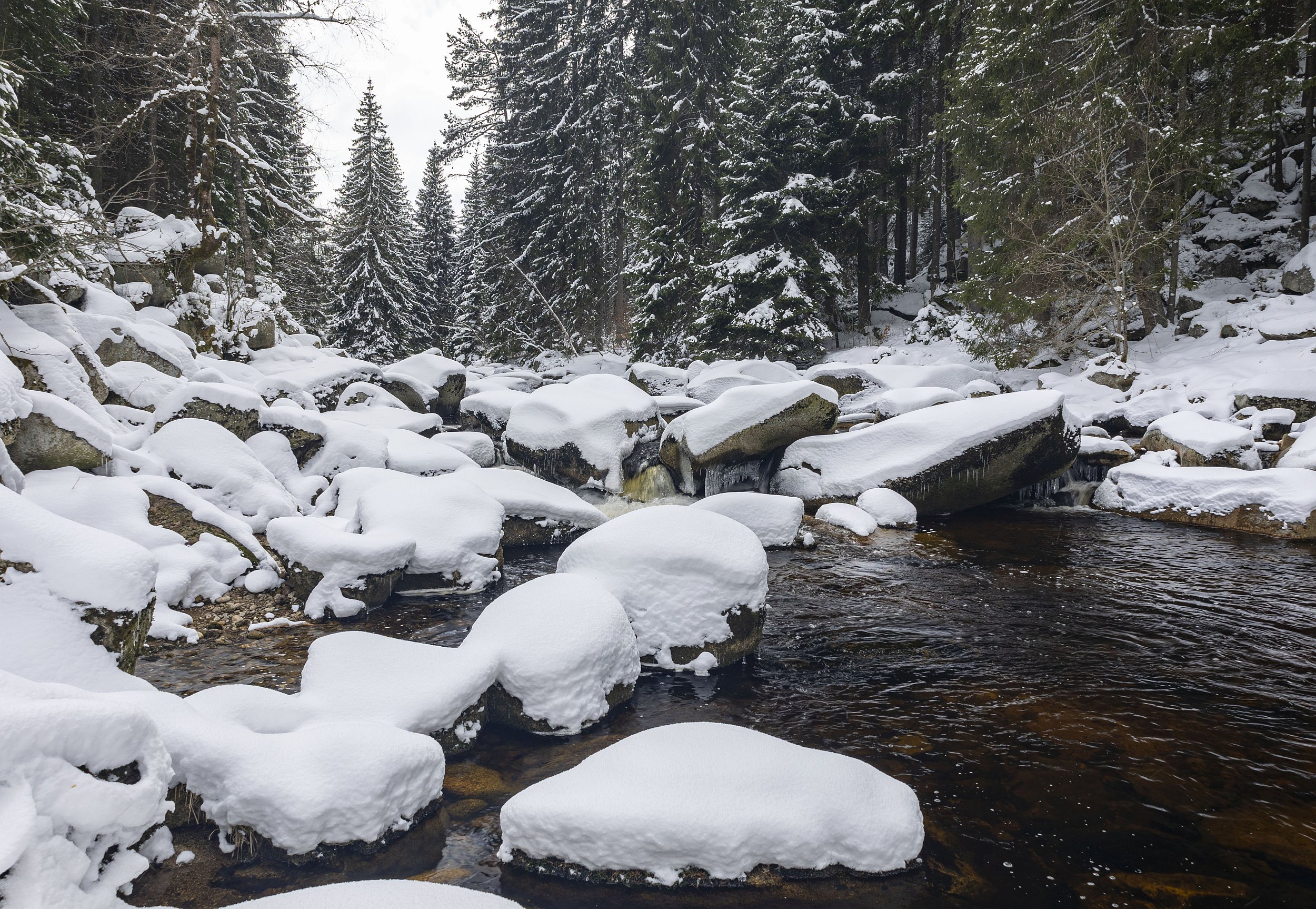 Zasněžená Vydra na Šumavě - v oblasti leží do 20 cm mokrého sněhu