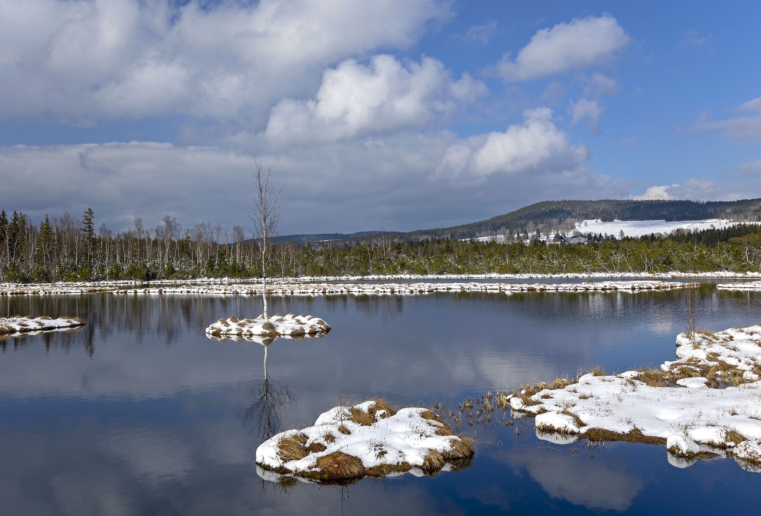 Chalupská slať na Šumavě dnes odpoledne - na chvíli se ukázala i modrá obloha, která se krásně zrcadlila ve vodní hladině