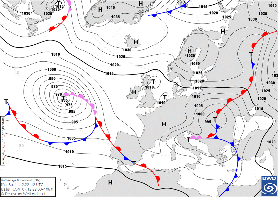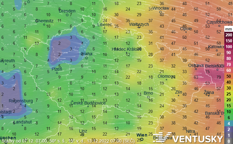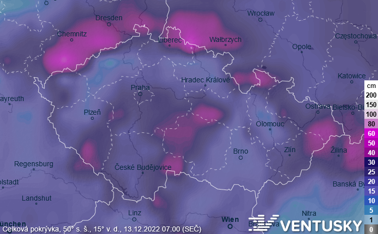 Předpovídaná výška sněhu v úterý 13. 12. ráno podle modelu GFS - tento model počítá s největším rozsahem sněhové pokrývky