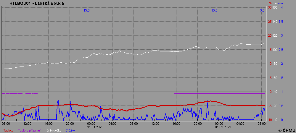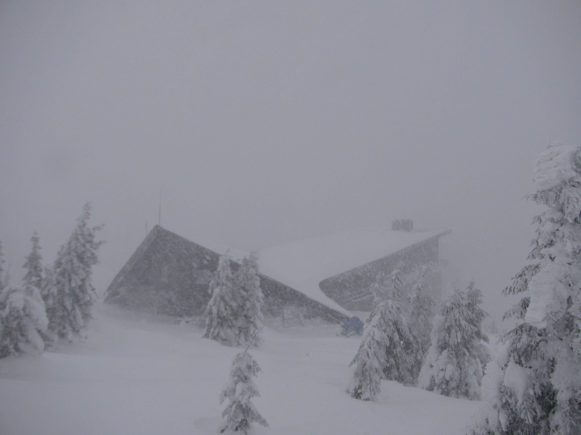 Labská bouda dnes v 9:00 - patrné je husté sněžení
