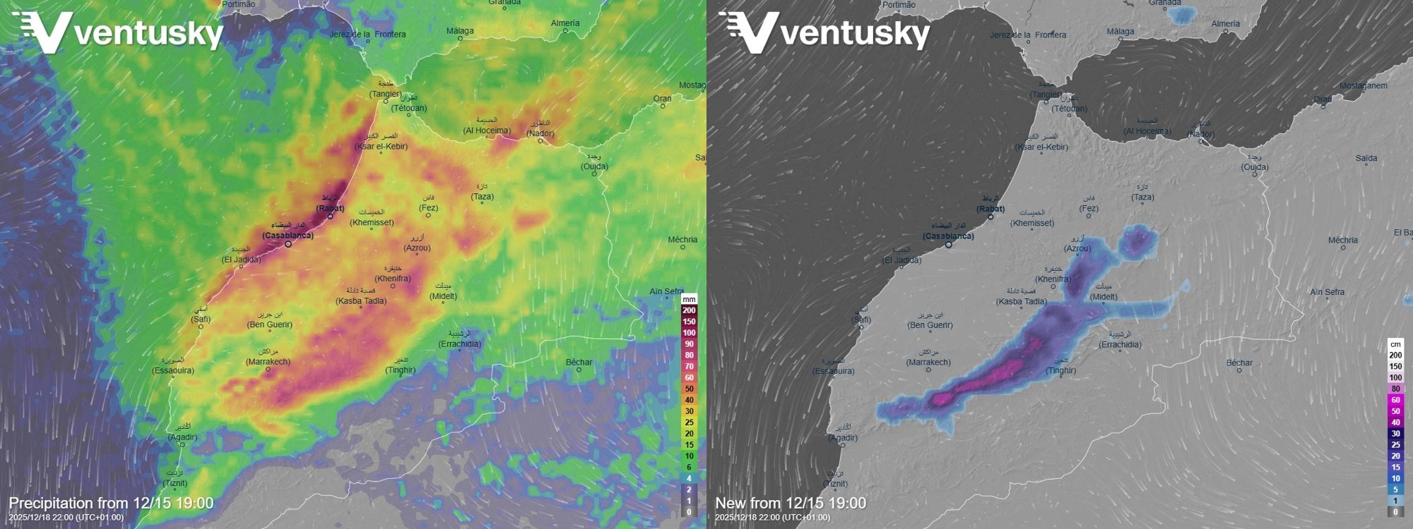Obr. 3 Rozložení teploty vzduchu v tlakové hladině 700 hPa (barevně) doplněné o izolinie geopotenciální výšky v tlakové hladině 500 hPa (černé izolinie) mezi 14. až 19. prosincem