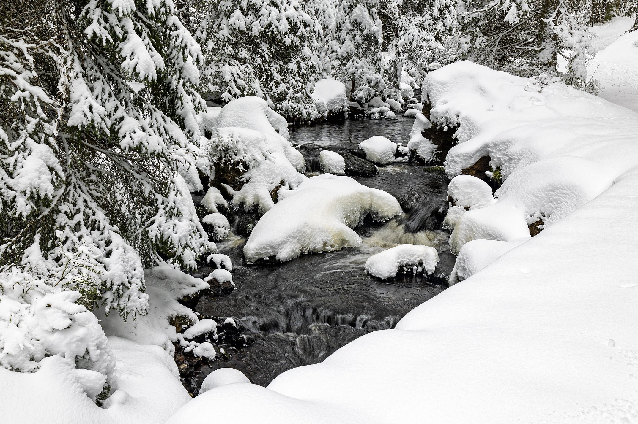 Zasněžený Filipohuťský potok, výška sněhu v okolí dosahuje až 40 cm