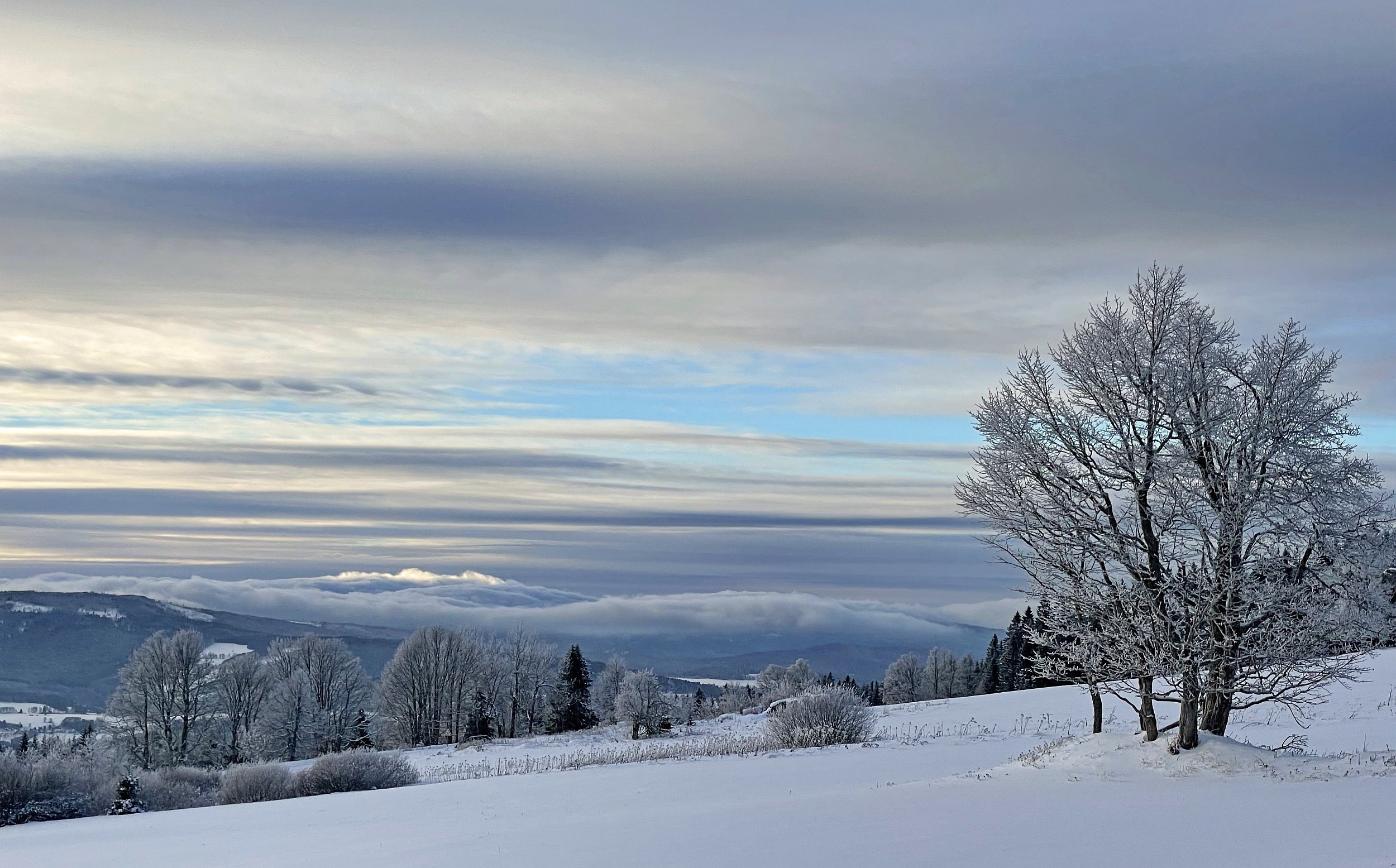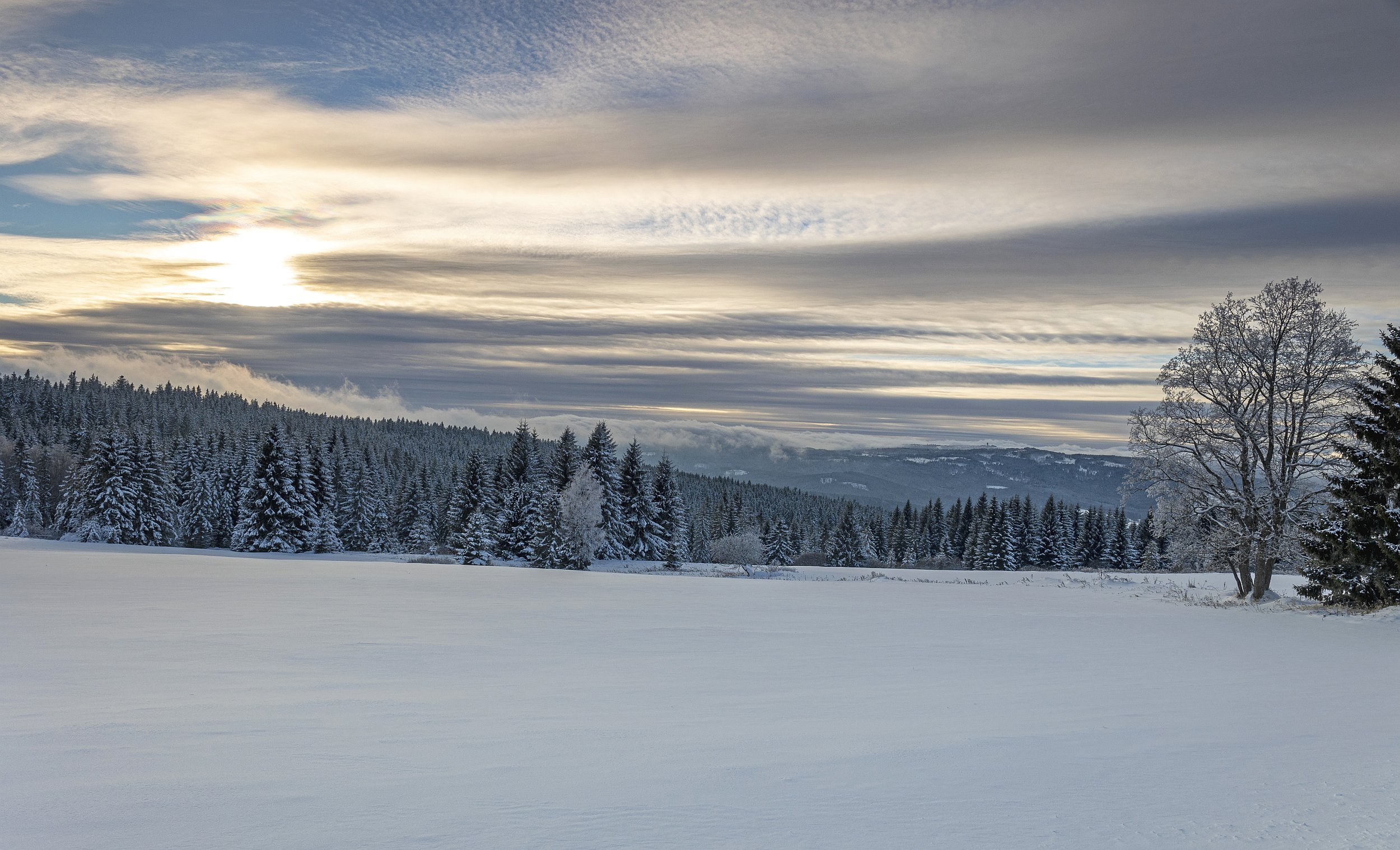 Přicházející teplá fronta k večeru na Zhůří přináší krásnou oblačnost, v levé části snímku jsou lehce patrné i Kelvin-Helmholtzova oblaka (drobné vlnky v oblačnosti). Na obzoru je naopak nízká oblačnost, která kopiruje hřebeny Šumavy.