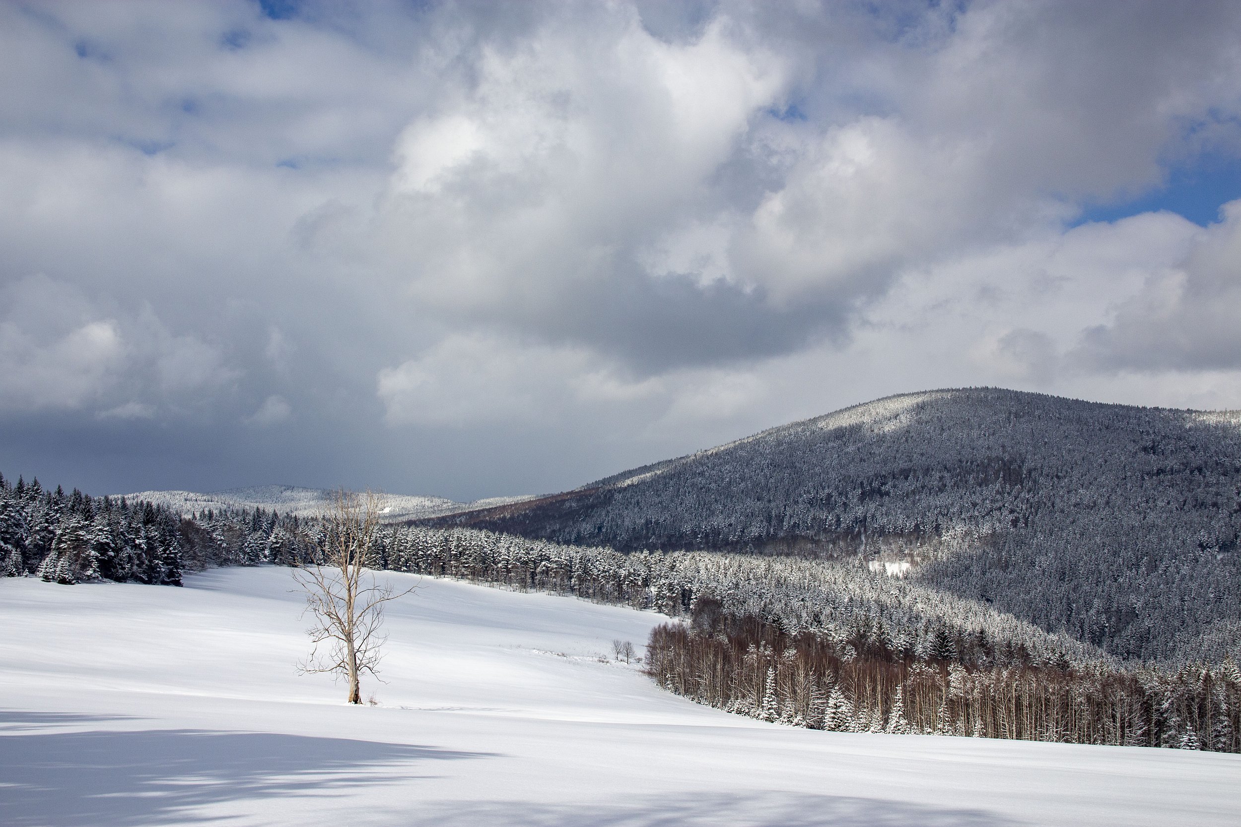 Zámyšl - pohled na zasněžený Svatobor v podhůří Šumavy, kde leží kolem 10 cm sněhu