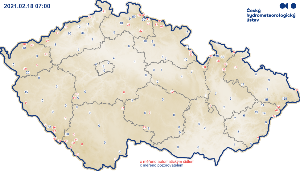 Stav sněhové pokrývky dnes ráno v 7:00 na stanicích v Česku - na jihozápadě už většinou roztál