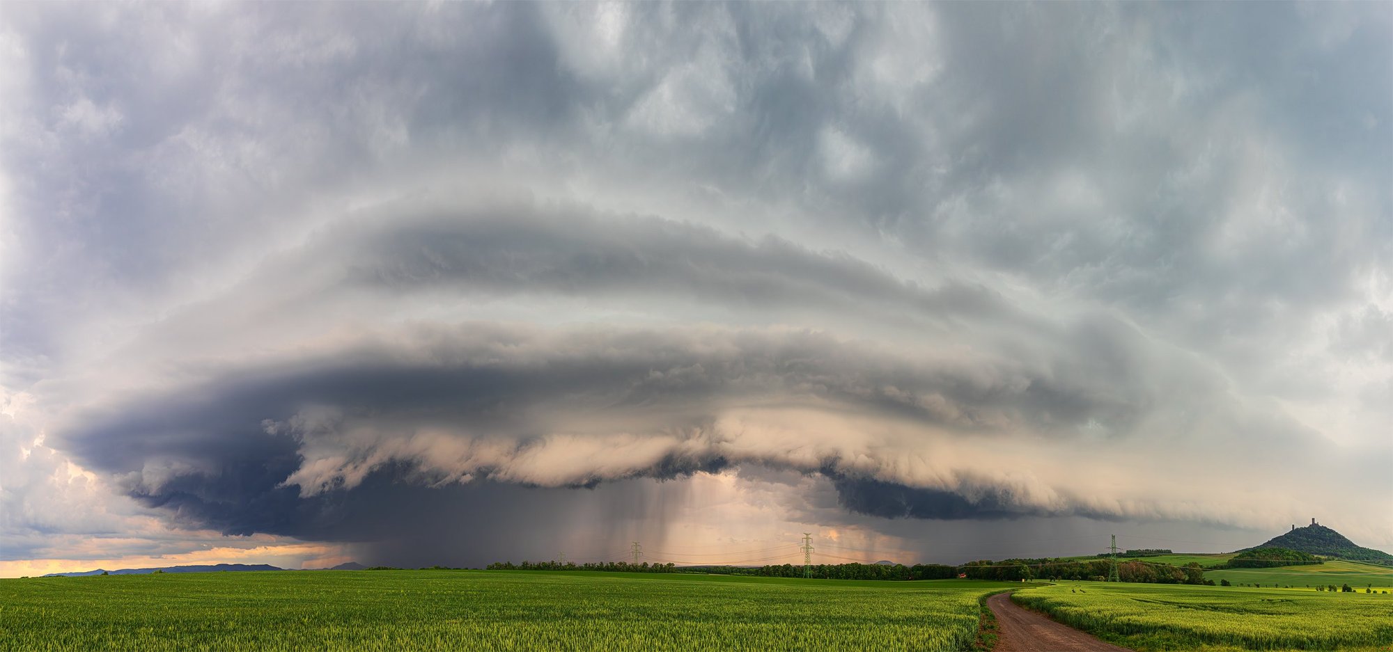 Mohutný shelf (arcus) cloud s historickým hradem Hazmburk v Českém Středohoří