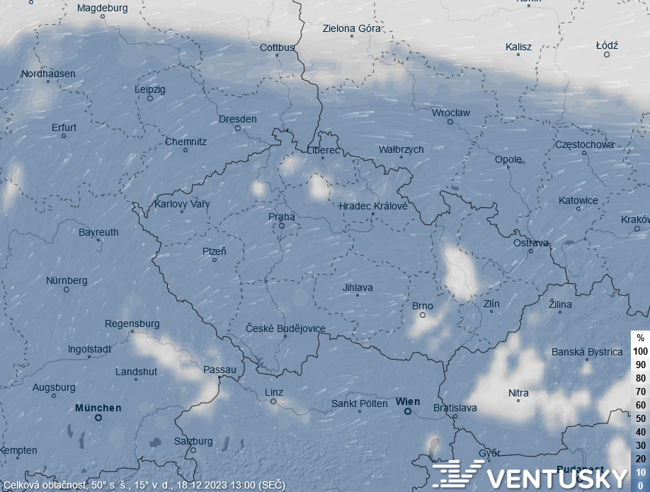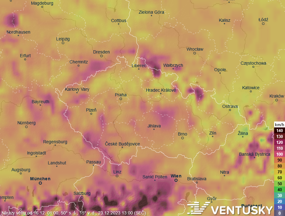 Očekávané maximální nárazy za celý příští týden - maxima mohou i mimo hory dosahovat až 90 km/h, předpovědi se ale ještě budou upřesňovat. Půjde však o potenciálně nebezpečně silný vítr