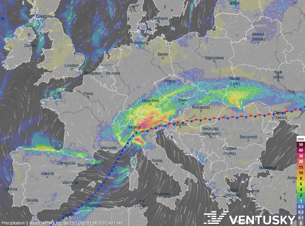 Srážky v Evropě v noci na dnešek - na výrazném teplotním rozhraní se utvořil frontální systém přinášející vydatné srážky. Střed tlakové níže se nacházel nad Alpami a nasával vlhkost ze Středozemního moře dále na sever