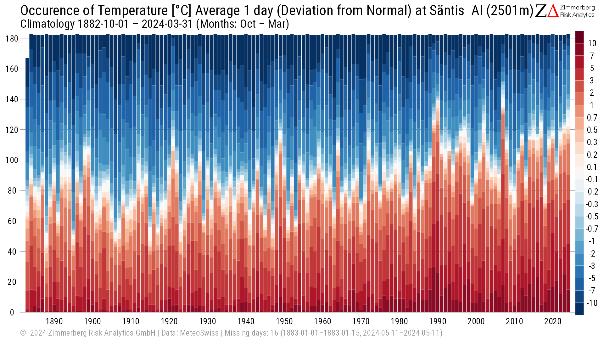 Vývoj teplotních odchylek v jednotlivých letech na vrcholu Säntis - je patrné, že v posledních letech se výrazně častěji vyskytují kladné odchylky od průměru (červeně) a naopak ubývá podprůměrných teplot (modře)