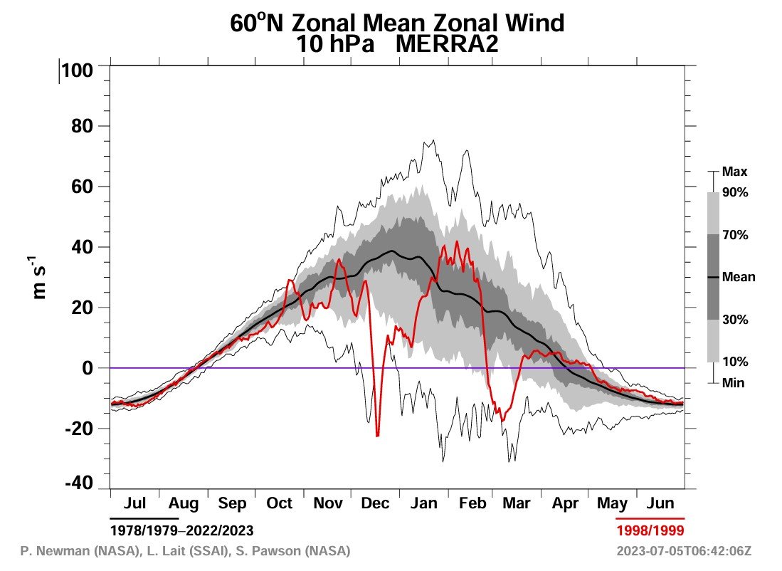 Obr. 5: Rychlost zonálních větrů na 60° s. š. v hladině 10 hPa (červená linie) v zimě 1998/1999