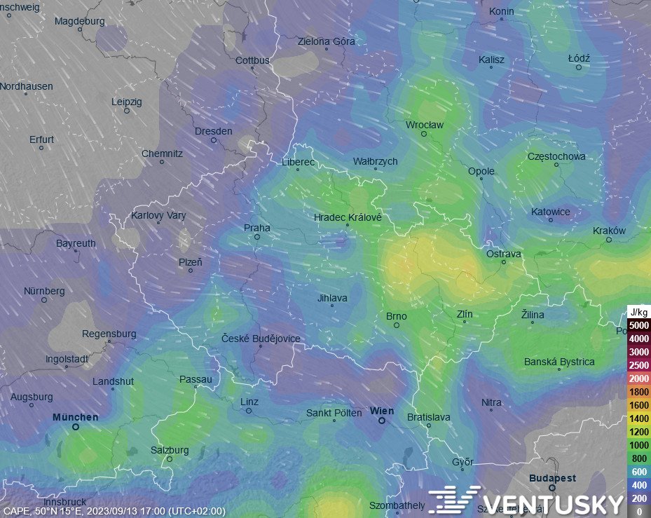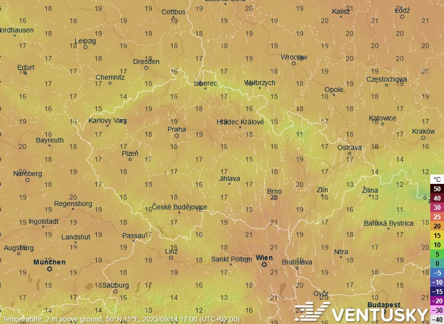 Očekávané teploty ve čtvrtek odpoledne - vystoupí většinou na 17 °C až 21 °C, což jsou normální hodnoty pro tuto část roku