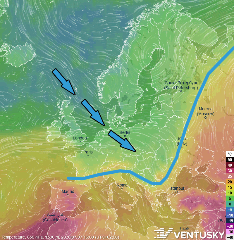 Teplota v hladině 850 hPa v úterý odpoledne - v této hladině je dobře vidět, jak do Evropy pronikne chladný vzduch ze severozápadu Evropy