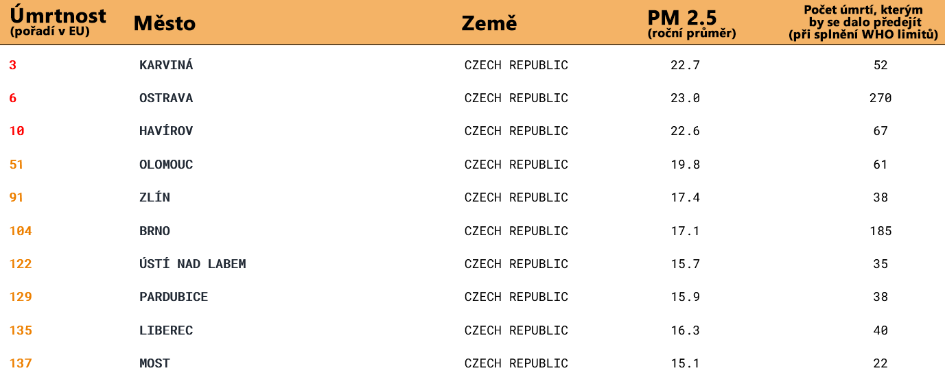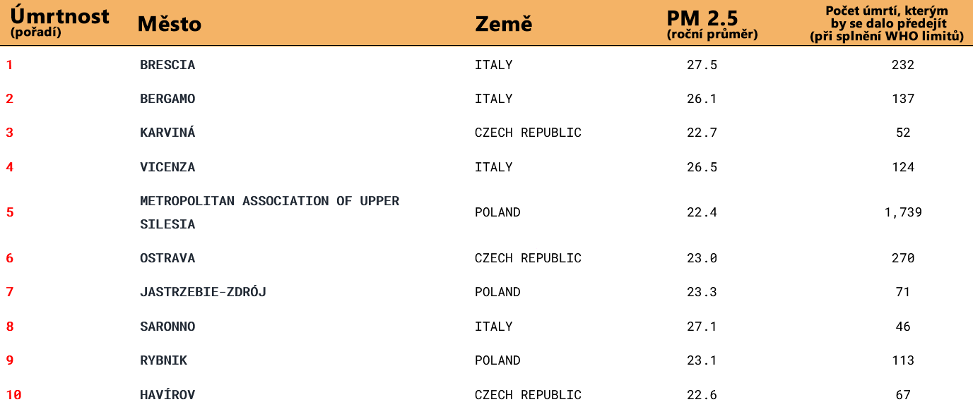 Přehled 10 měst s největší úmrtností (relativně k velikosti měst) kvůli vysokým hodnotám jemného prachu v ovzduší (PM 2.5) v Česku