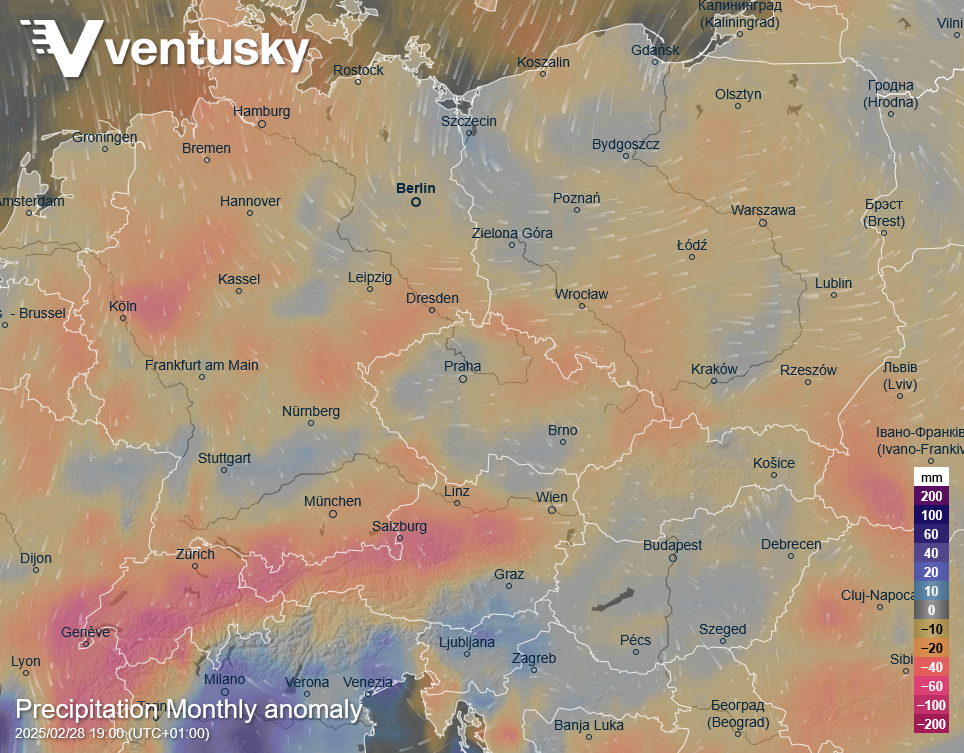 Během letošního února spadlo v Česku relativně nejméně srážek – na mapě znázorněny odchylky měsíčních úhrnů od dlouhodobého průměru (mapa ukazuje odchylku srážek od průměru za posledních 40 let)